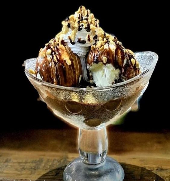 Dark chocolate cake with two scoops of vanilla ice cream, loaded with hot chocolate fudge, chocolate sauce ,whip cream and cashew nuts.